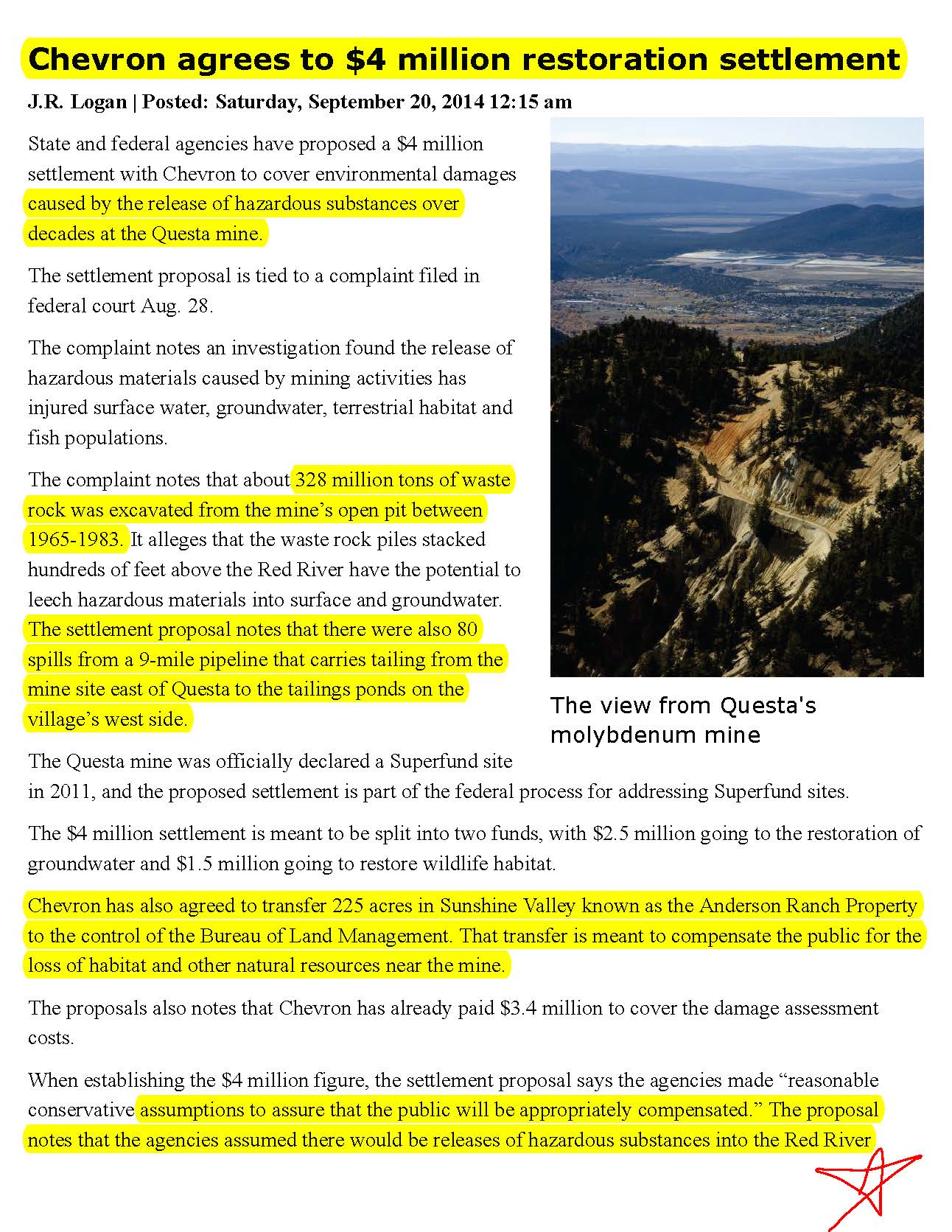 […] region? This clean up will eventually cost someone (but not Chevron) nearly a billion dollars (https://schatziesearthproject.com/2014/11/25/taos-new-mexico-article-about-chevron-mine/). And then, also in your Consent Decree, DOJ makes Chevron promise not to have any future claims or […]