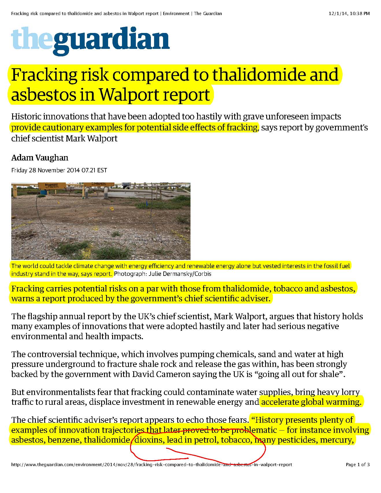 The Guardian piece (below) points out the implicit dangers in fracking, comparing it to the thalidomide scandals, the tobacco settlement, and other threats to public health. Okay, I’m skipping over a few linkages they haven’t made yet, but YAY YAY YAY! Forget those upcoming UN talks in Lima, Peru. NOTHING of substance is going to happen because, as they even admit, the fossil fuel industry is still calling the shots in the biggest polluter nations.