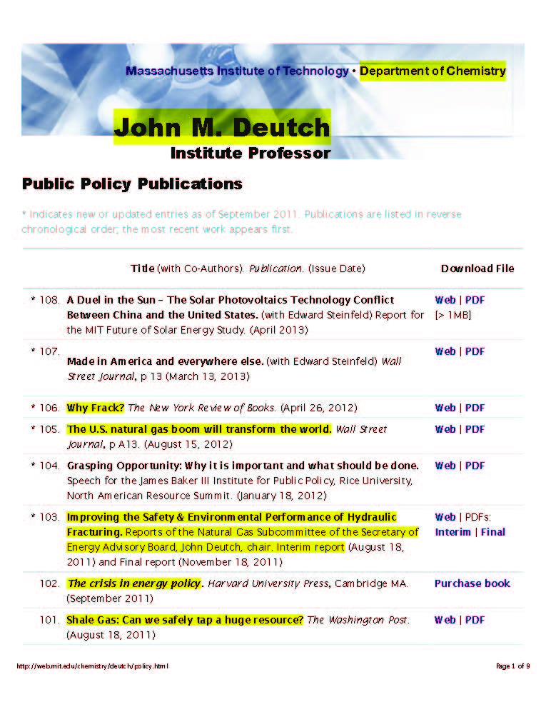 His proximity to and interactions with the Department of Energy began nearly 40 years ago, in 1977, and continue (and are amplified) to this very day, where he is on the prestigious and crooked Secretary of Energy Advisory Board (SEAB), which does things like oversee the creation of FracFocus.org and lots of other projects and money pits that guide the Energy Department further and further into fossil fuel laden waters where they remain. Not that they wouldn’t be there anyway. DOE Secretary Moniz and Deutch have a relationship going back literally decades.