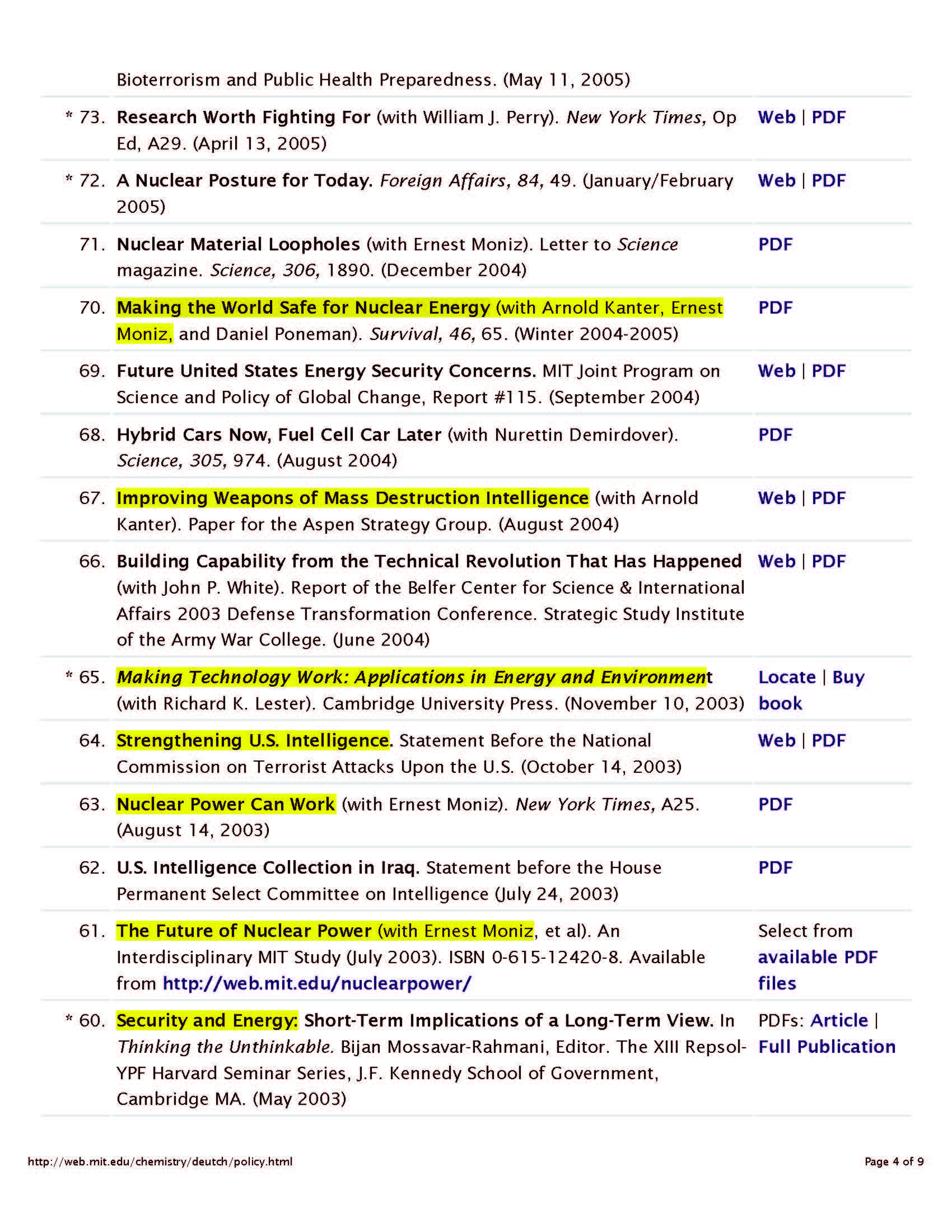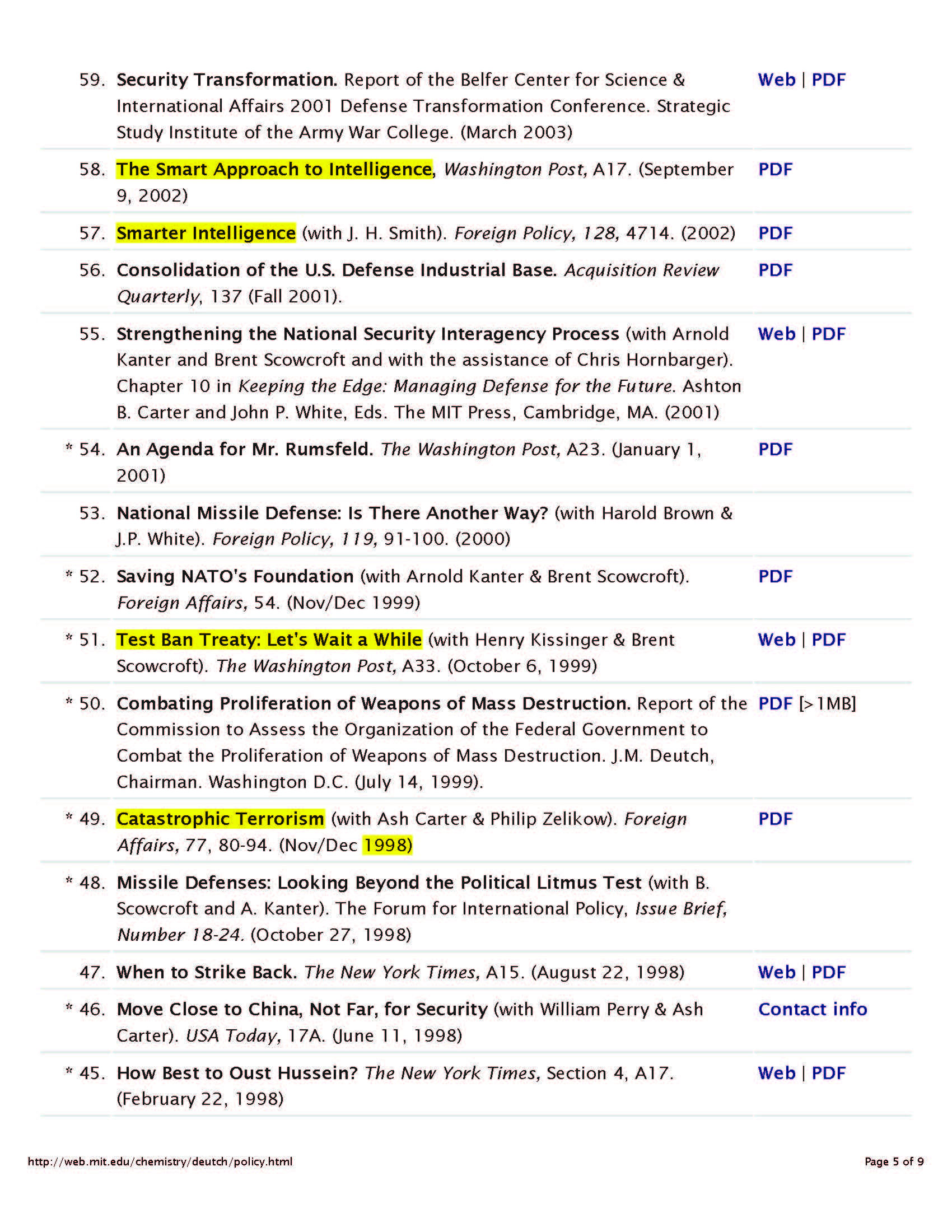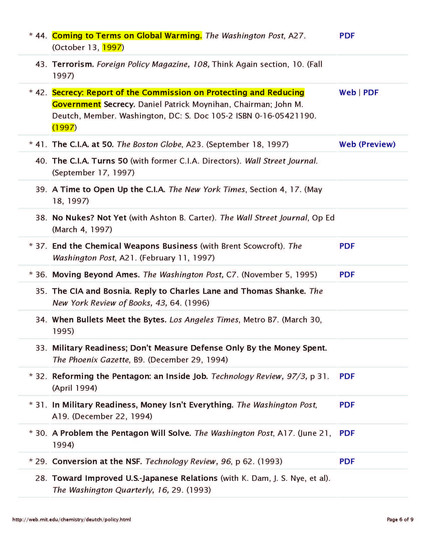 As you can see by the above biography, Deutch has ping-ponged around many governmental agencies…Department of Energy, Department of Defense, several Presidential Advisory Boards, Department of State, he was the head of the CIA, lots of different Intelligence Advisory Boards, etc. All the while (and remember that he’s a trained chemist), he’s writing a smattering of actual chemistry papers (thanks Bill for helping me decipher the chemistry), and lots of policy papers, whose topics reflect the times he lived in. I will tell you that two of his papers, one on global warming and the other on the threat of massive terror attacks are eerily prescient.