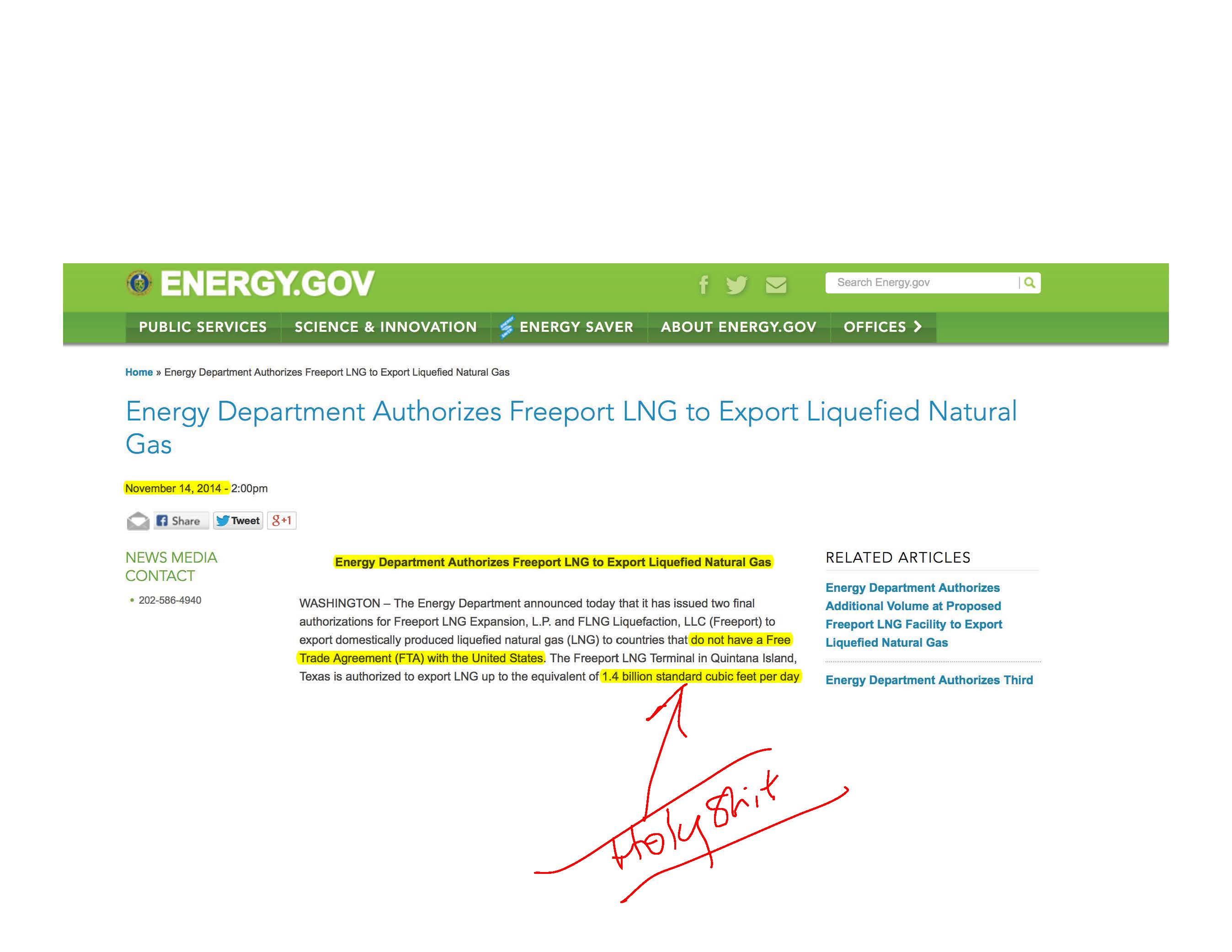 The Department of Energy has gone so far as to allow Freeport to do this environmentally damaging and unnecessary business with not only our existing Free Trade partners, but, in a feat of greed and overconfidence that exemplifies that their power will never, ever be enough for them, DOE is granting them permission to do business with countries who do NOT have Free Trade agreements with the US, but who may, at some point, enter into agreements with the US. Does that include aliens from another planet? You bet. Just so long as it is looped into the Free Trade Agreement, it is automatically “in the public interest.”