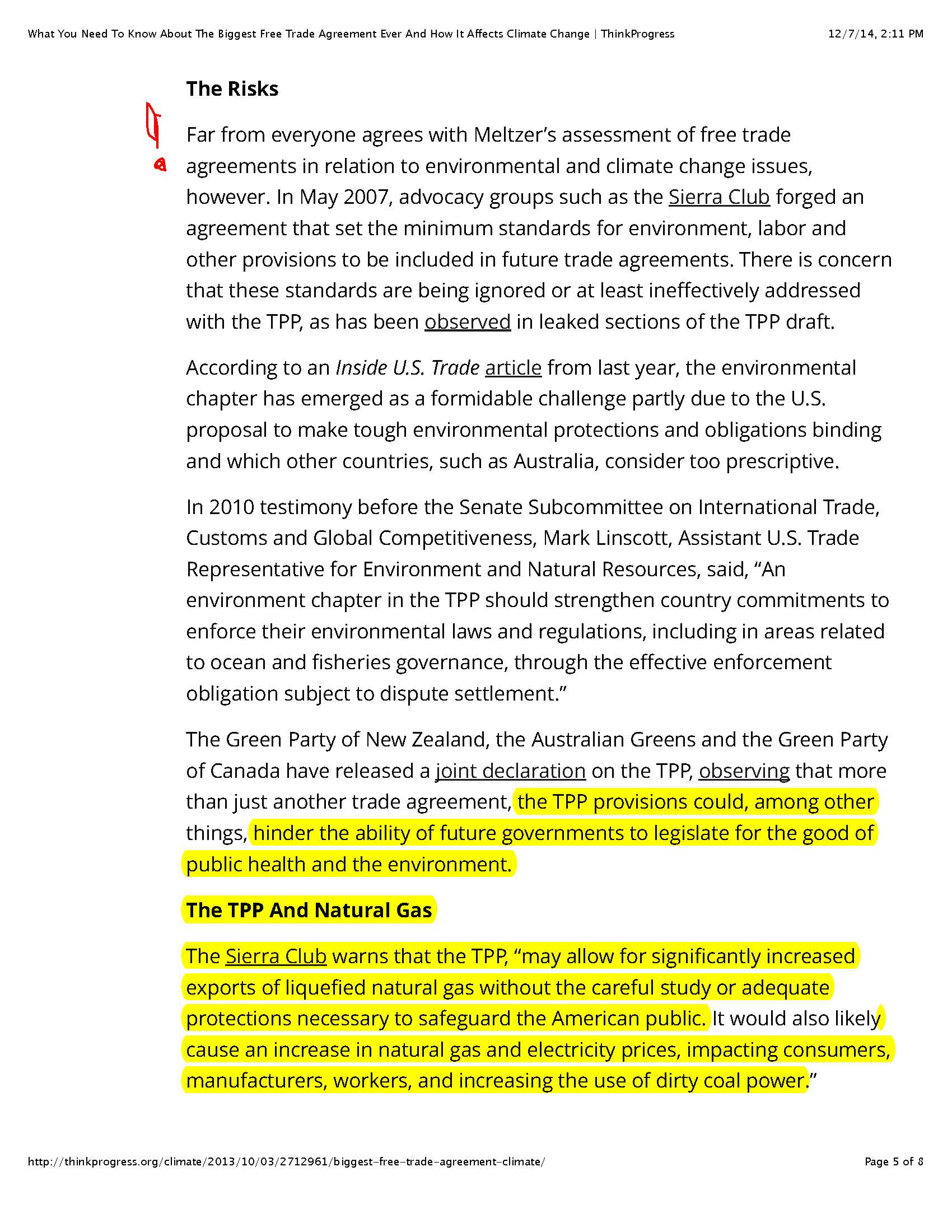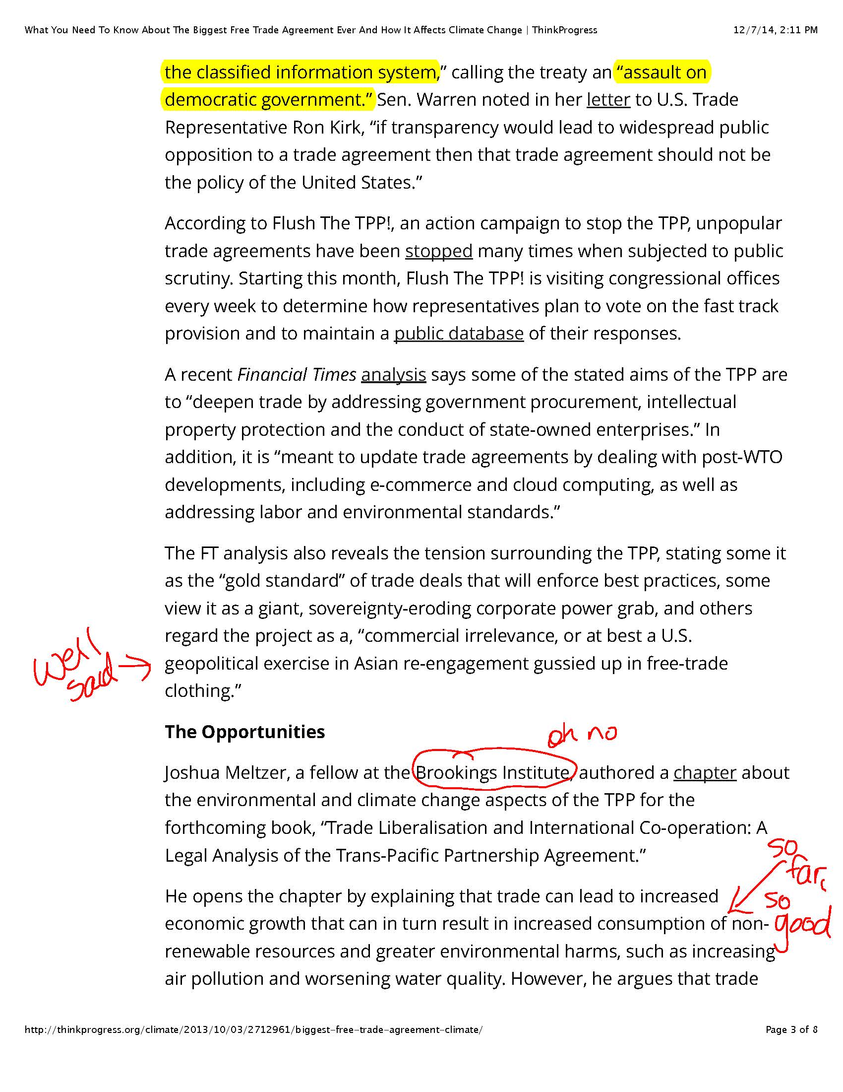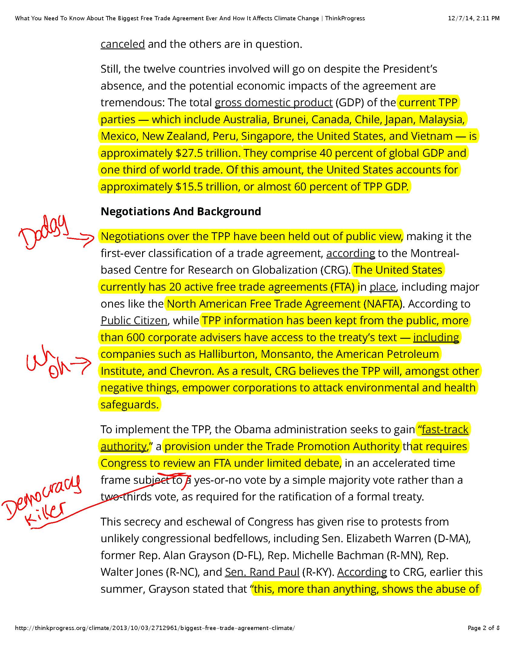 Various free trade agreements provide cover for all kinds of nefarious activities, because once attached to whatever you want to get away with, by definition, those activities are instantly deemed ‘in the public interest,” and therefore, impossible to “disprove” as actually NOT in the public interest. If it sounds childish (it’s like “calling dibs,” right?), please look through this ThinkProgress article from about a year ago and I know you think, “Why on earth should I care about something as distant and obscure as a free trade agreement, NAFTA, etc. How does it impact anything I actually see and feel?” But, it’s important: