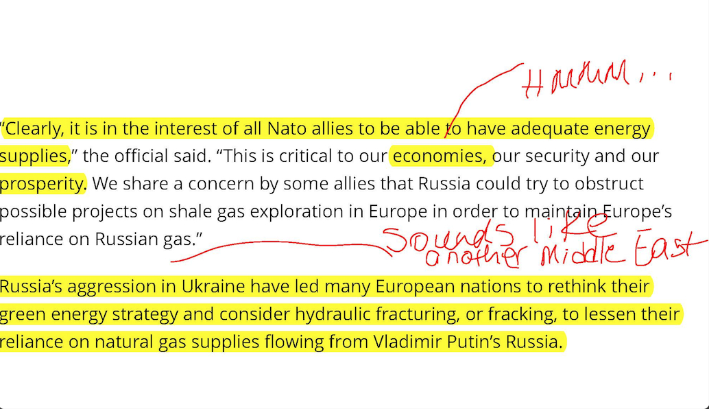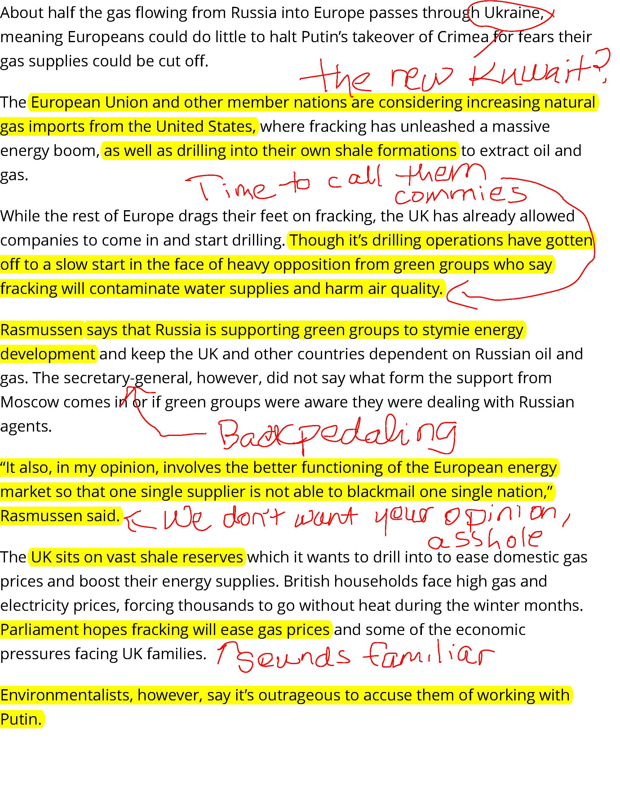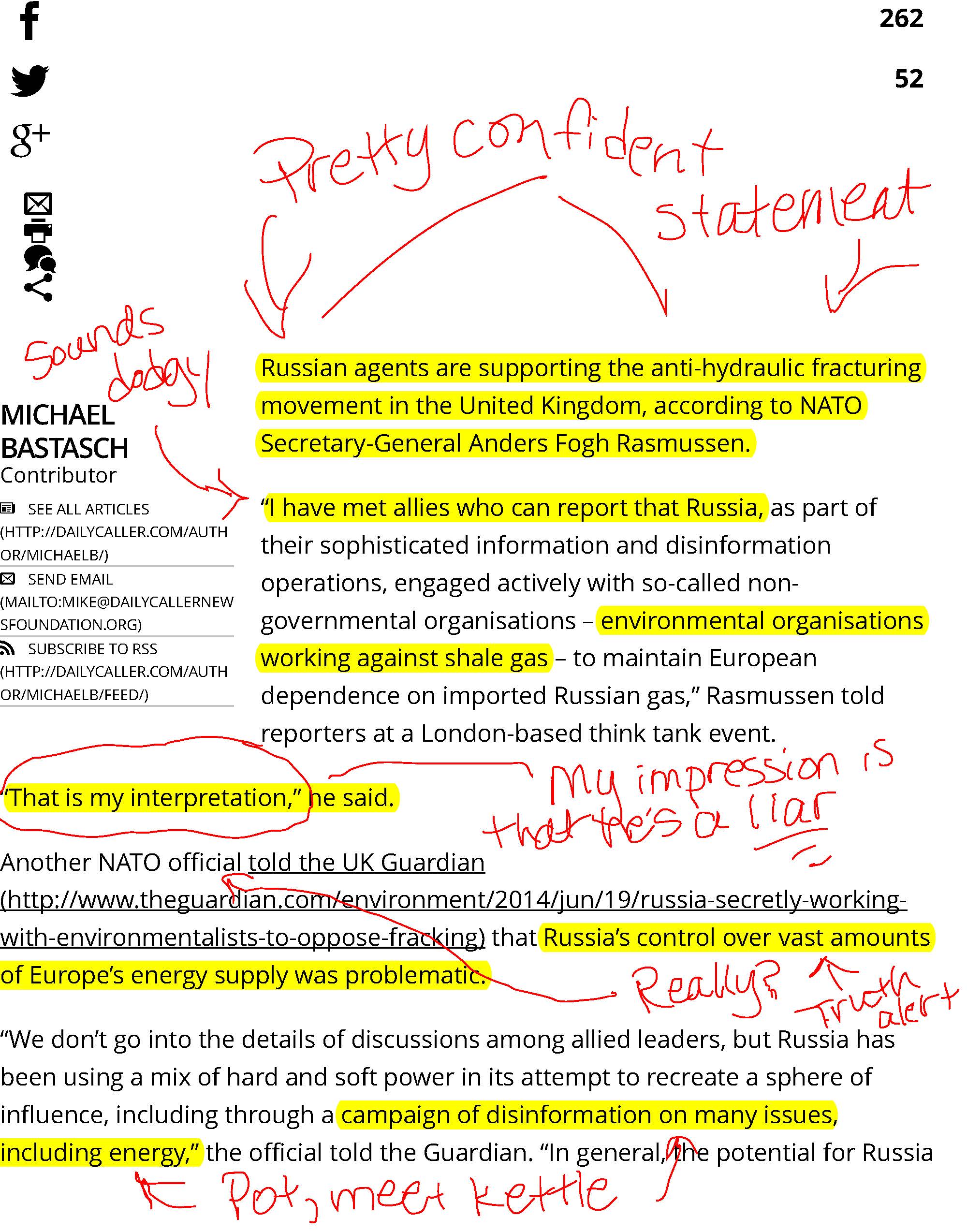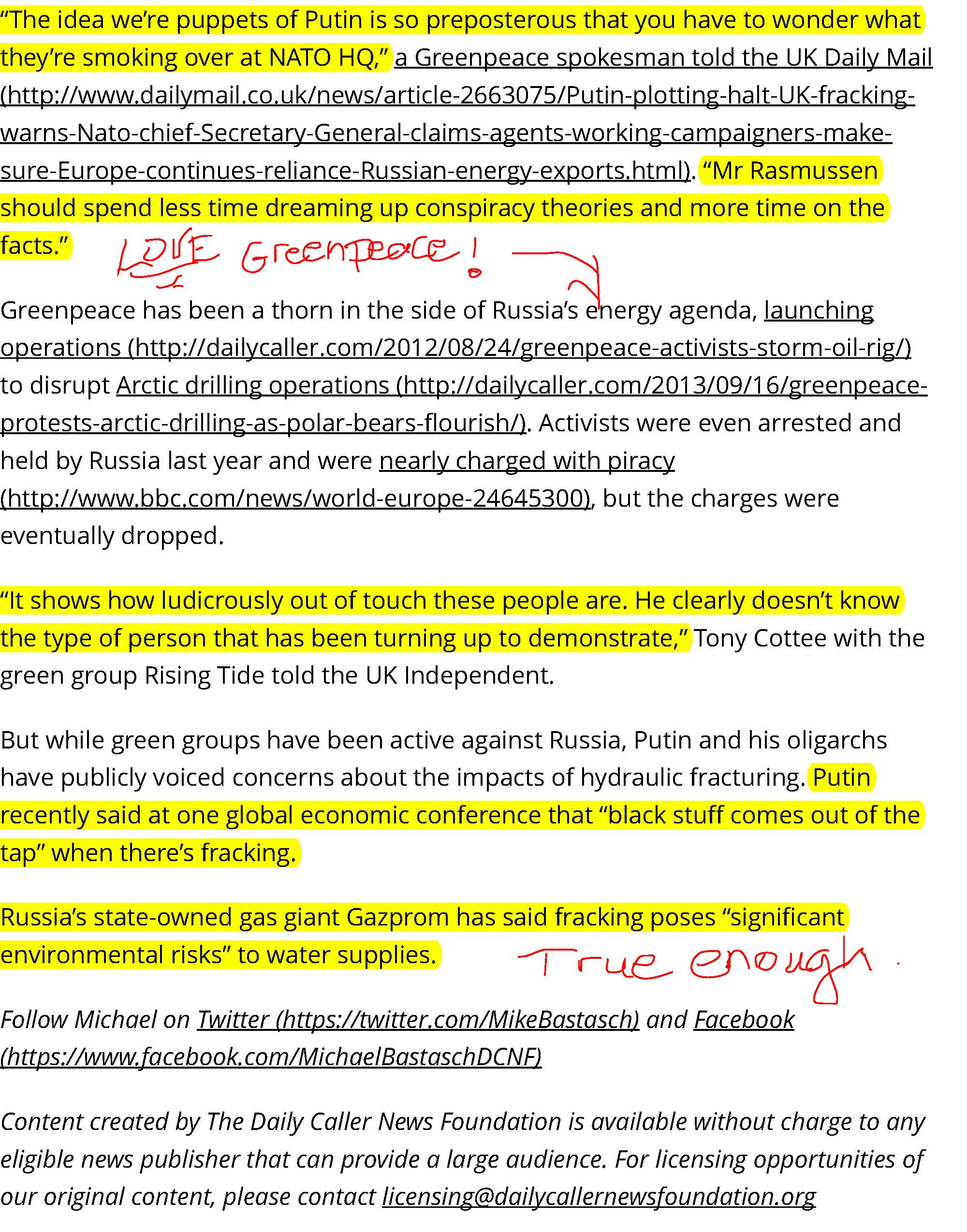 Lessons learned from the tobacco industry include, but are not limited to, that old chestnut of saying something enough times and in as many places as possible until it becomes a “fact.” Or at least something that gets ingrained in our collective consciousness. Where did this Russian conspiracy notion come from? Here’s a clue in The Daily Caller from June 2014 (be sure to read the last page of this article. Greenpeace says what everyone is thinking about NATO’s odd announcement):