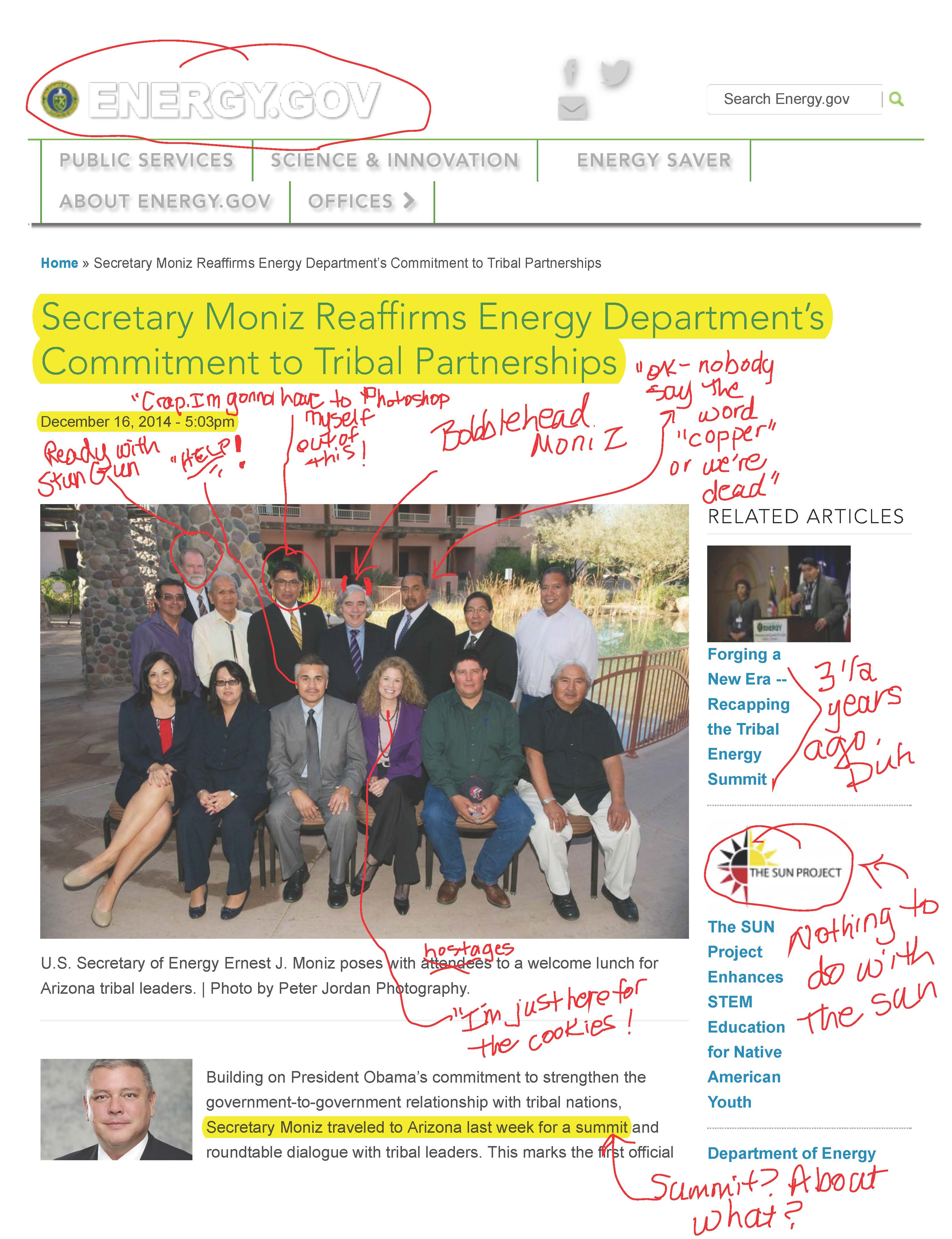 I feel so horrible for these tribal leaders. I don’t know if they realize that the Department of Energy played a huge part in the stealing of the Apache tribal lands in Arizona which was coincidentally being formalized in Congress just as this “first ever” meeting with the Department of Energy Secretary Ernest Moniz was taking place.