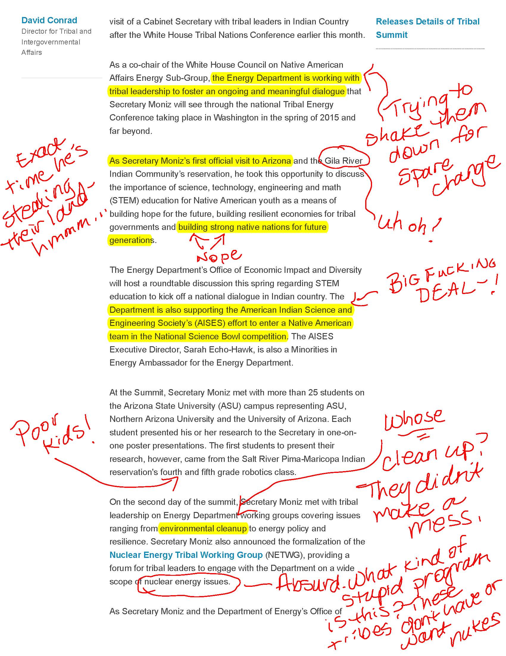 Anyone else find it odd that he’s in Arizona, meeting with native Americans, throwing around grandiose ideas for their children’s future as he’s simultaneously helping the government steal their sacred, and previously protected site? The Energy website is playing up some program which bizarrely incorporates native American tribes and nuclear energy. I know that if I were part of a tribe in Arizona, I would start stocking up on lead underwear.