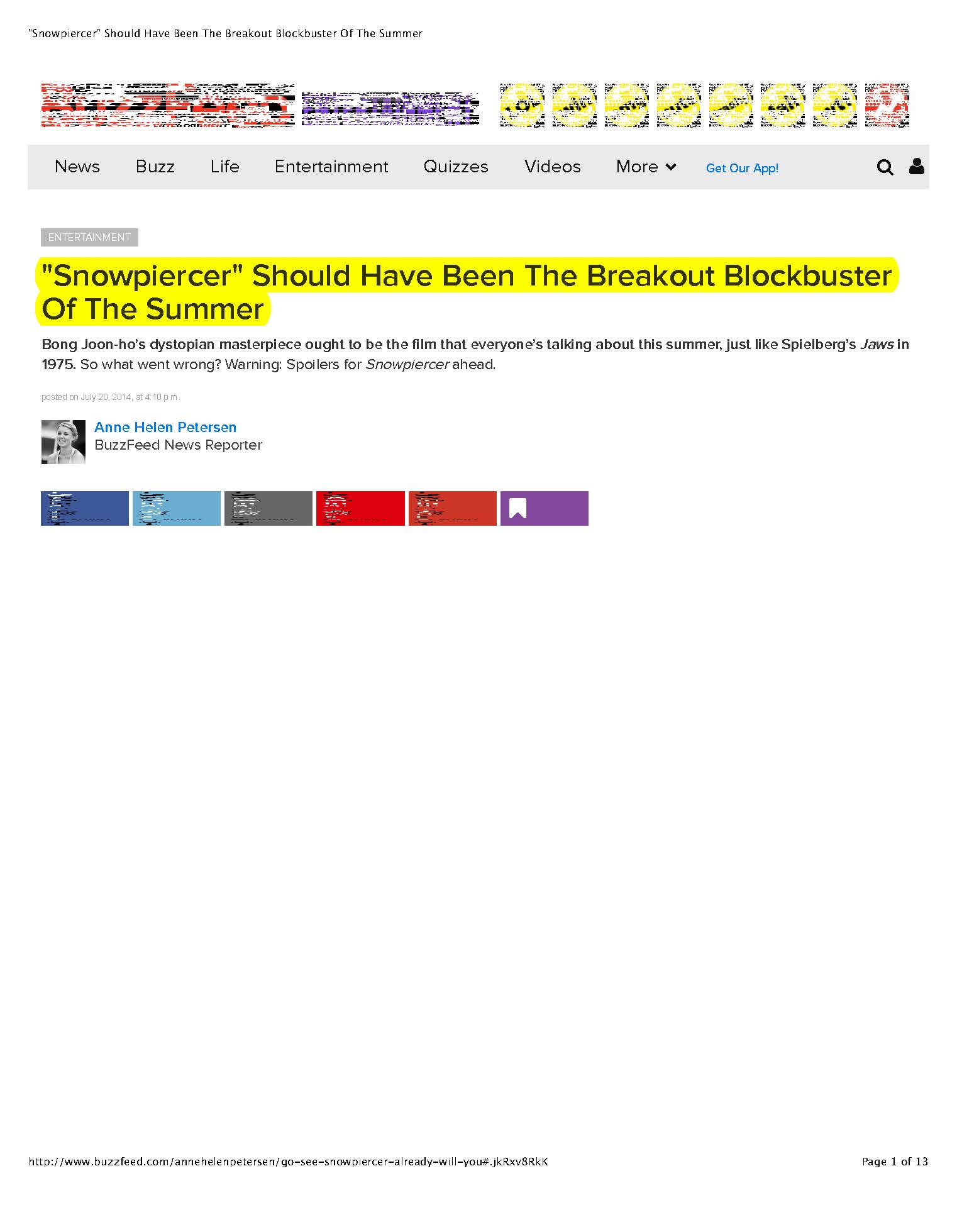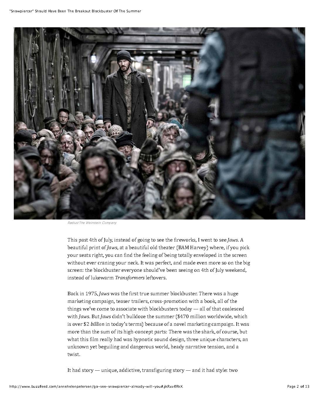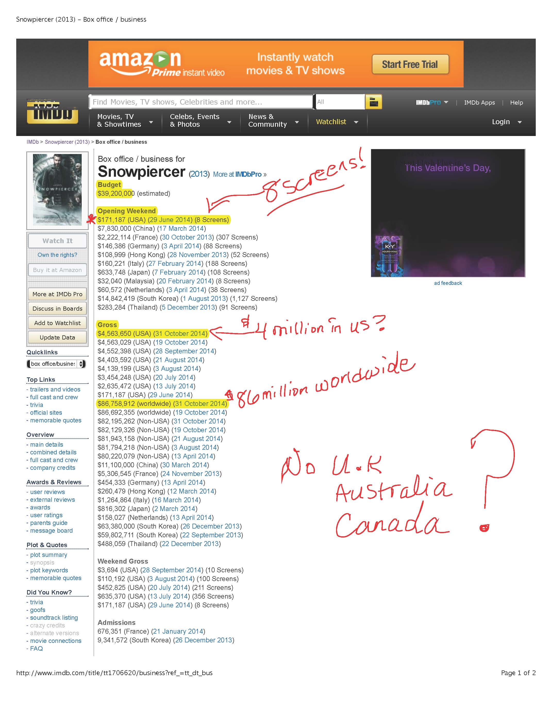 I couldn’t believe that a movie starring Chris Evans (Captain America), Octavia Spencer (The Help), Tilda Swinton (Benjamin Button), John Hurt (Harry Potter) and Ed Harris (Gravity, The Hours) could fly under our radar. Okay, this movie did have an odd pedigree given that it was based on a French graphic novel (Le Transperceneige) and was directed by a South Korean filmmaker (Joon-ho Bong) but considering it’s big name international “star power,” and how truly mindbending and thought-provoking it turned out to be, with incredible special effects and a story that seemed terrifyingly plausible (Think: climate crisis has led to geoengineering attempt gone horrifically wrong, blend in a little “Clockwork Orange” and add a dash of “Crouching Tiger, Hidden Dragon”), well, it SHOULD have been a blockbuster. Instead this was how the numbers played out, according to IMDB, and notice that this English-speaking film has virtually no presence in countries where it should have been especially popular:
