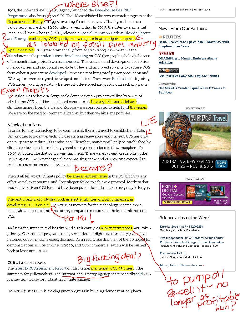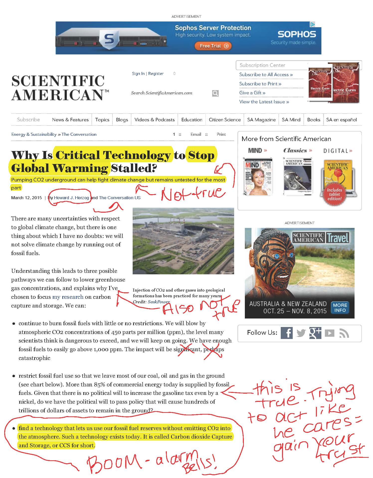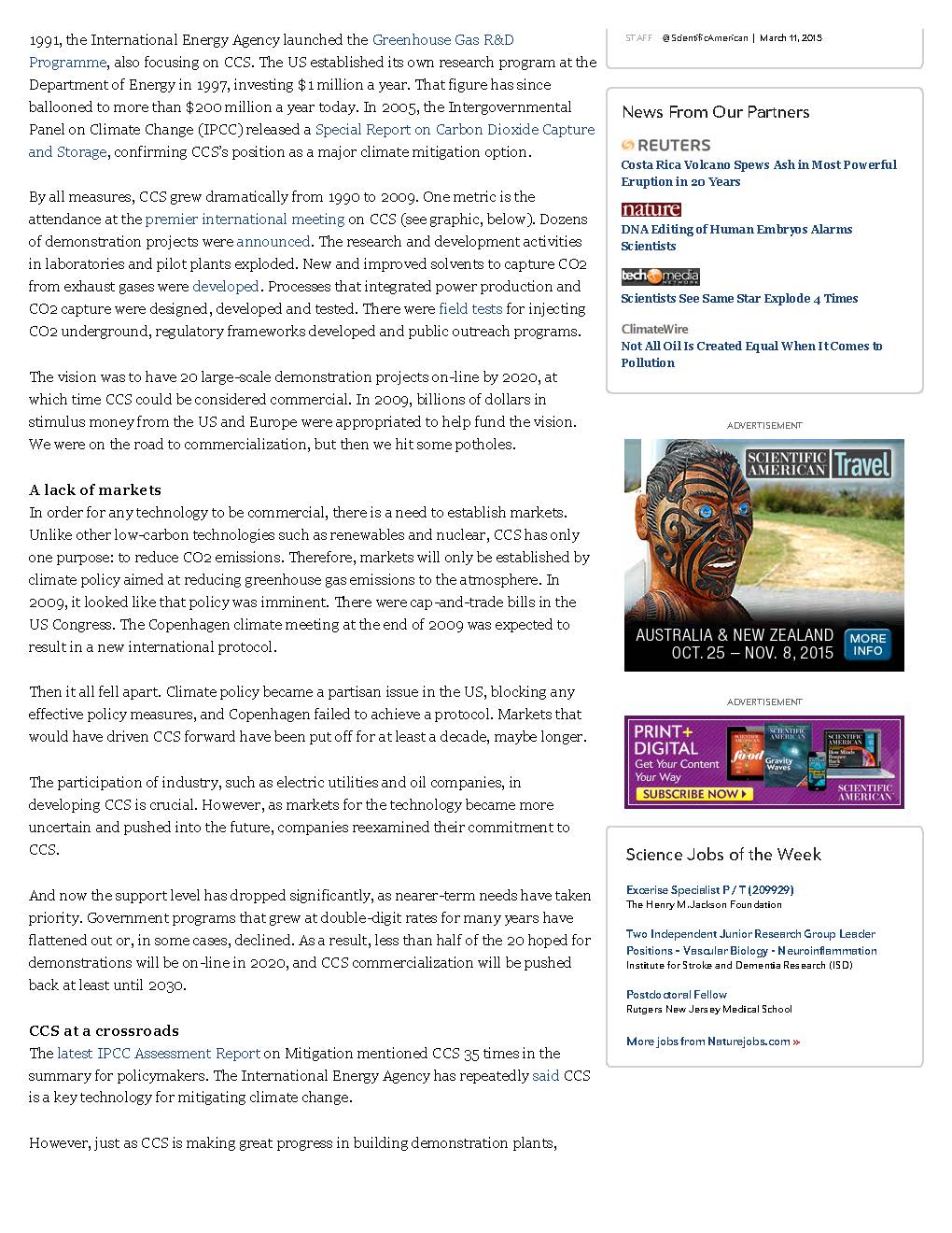 Philosopher Maimonides is quoted as saying, “Give a man a fish and you feed him for a day; teach a man to fish and you feed him for a lifetime.” In that same vein, I’d like to use something that recently appeared in Scientific American magazine. It was eye catching, for me at least, because I write about climate change, the fossil fuel industry, and the environment. And carbon capture and storage (CCS) grabs my attention as well, but not for the reasons you might think.