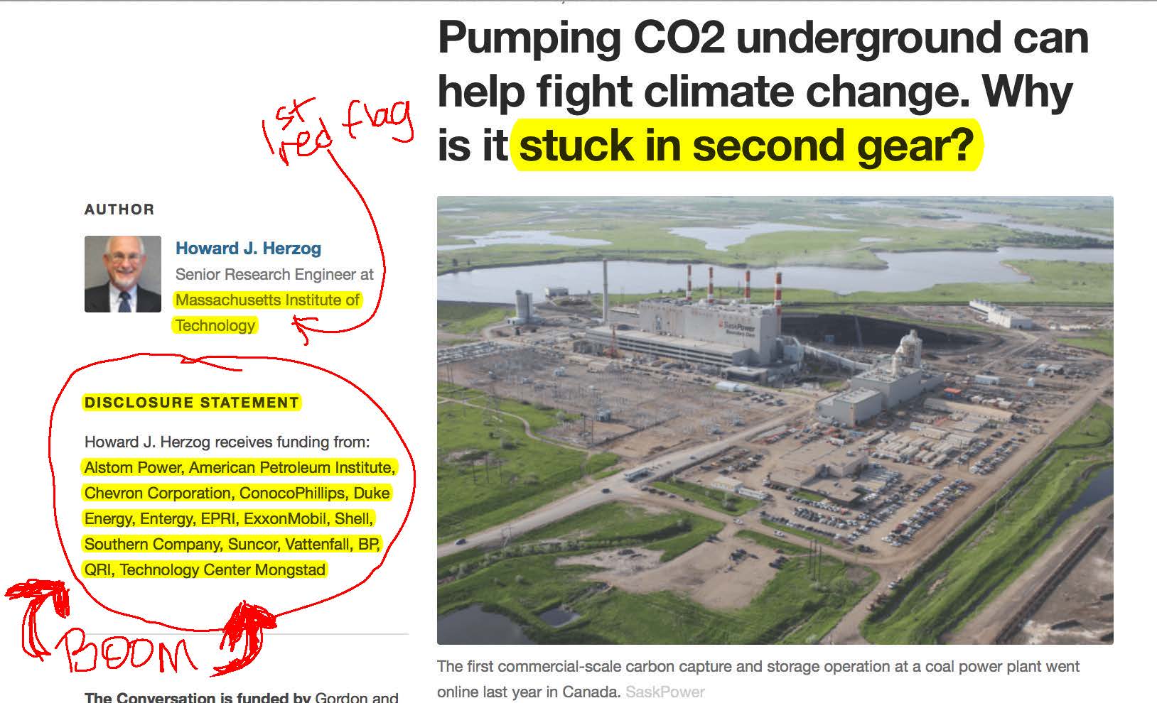 Herzog, who clearly needed more cash to afford whatever his expensive habits are, was just casting out his fishing hook, seeing who’d take his bait. It apparently got reeled in and now this rotting, petroleum soaked, bottom-feeding mess is being served up to you, via several media outlets, It will inevitably be circulated again and again, in an unending attempt at resuscitating the CCS “final solution” to global warming.