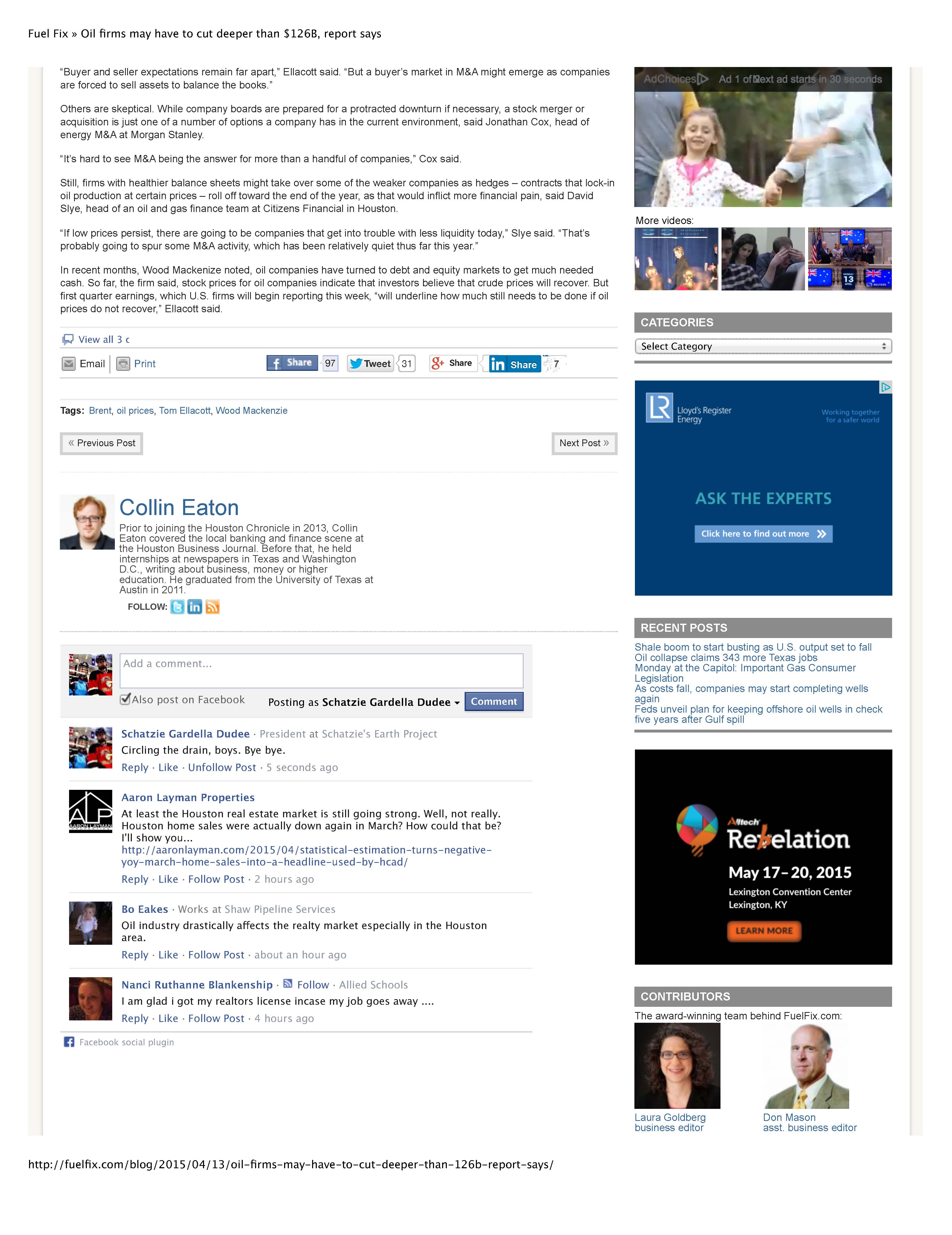 So, keep in mind that the first quarter for businesses ended March 31, 2015. The economic news out of the fossil fuel industry is grim. Again, keep that big picture in mind: