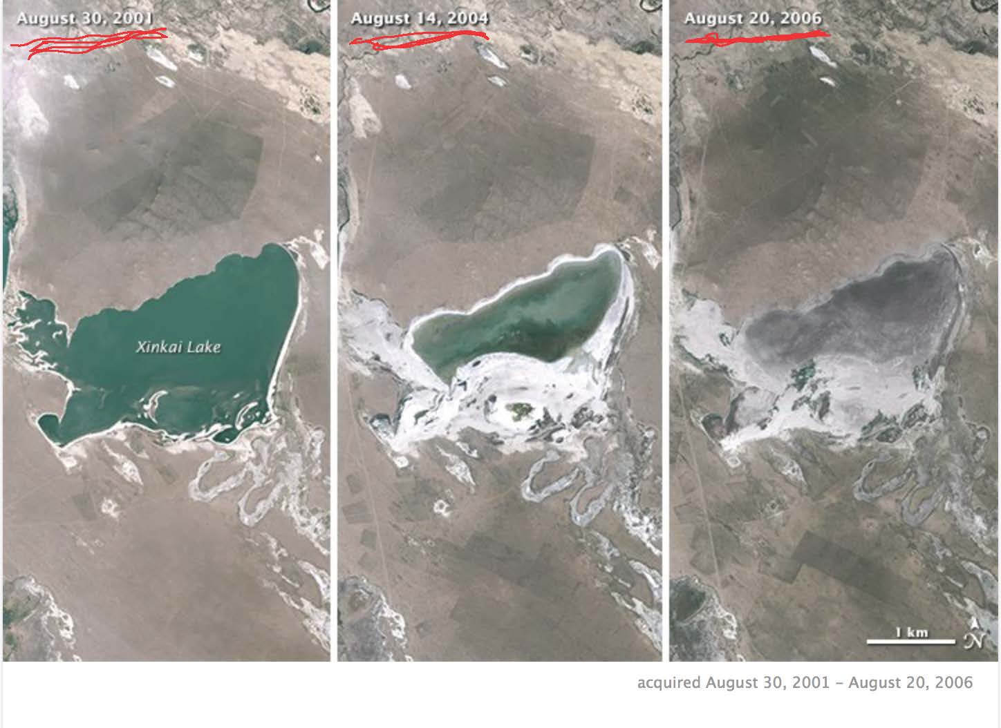 NASA recently published photos, taken by LANDSAT, of serious lake decline on the Mongolian Plateau. These lakes are shrinking into non-existence due to global warming and climate change, which are altering precipitation patterns in that region. The whole process is being sped up by intensive mining and farming activity. All of these things are, of course, entirely manmade and entirely avoidable.