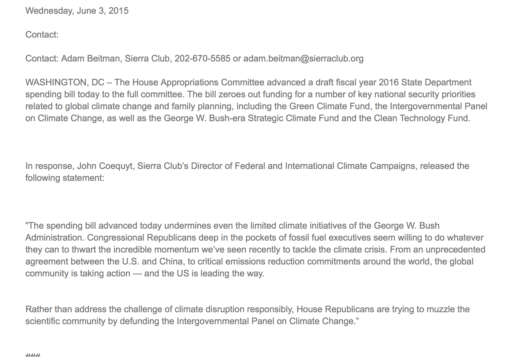 This was the Sierra Club’s response to the House Appropriations Committee’s end run: