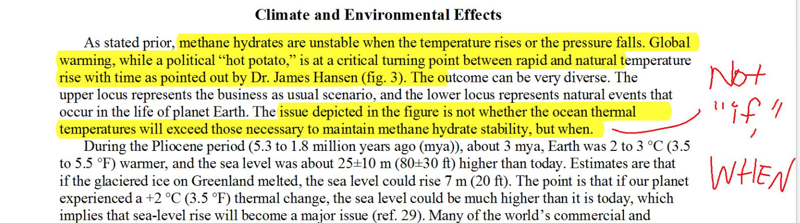 His full paper is in the document frame below. As usual, I’ve highlighted parts of it. Hendricks refers to aviation fuel in this paper because that was one of his primary areas of interest at NASA, but his conclusions are crystal clear: Find the methane hydrates and capture them before they spontaneously become unstable and are unleashed from their safe enclosures (such as permafrost, which is melting). This will, as he says, essentially kill all or most life on Earth. Such an incident, as he mentions, is suspected to have occurred in the Permian Mass Extinction, or Great Dying, 252 million years ago when an abrupt instability in the methane hydrates locked safely below the surface was created due to climate change. This resulted in 96% of aquatic life and 70% of terrestrial life going extinct and is believed to be the closest that Earth has ever come to becoming a dead planet.