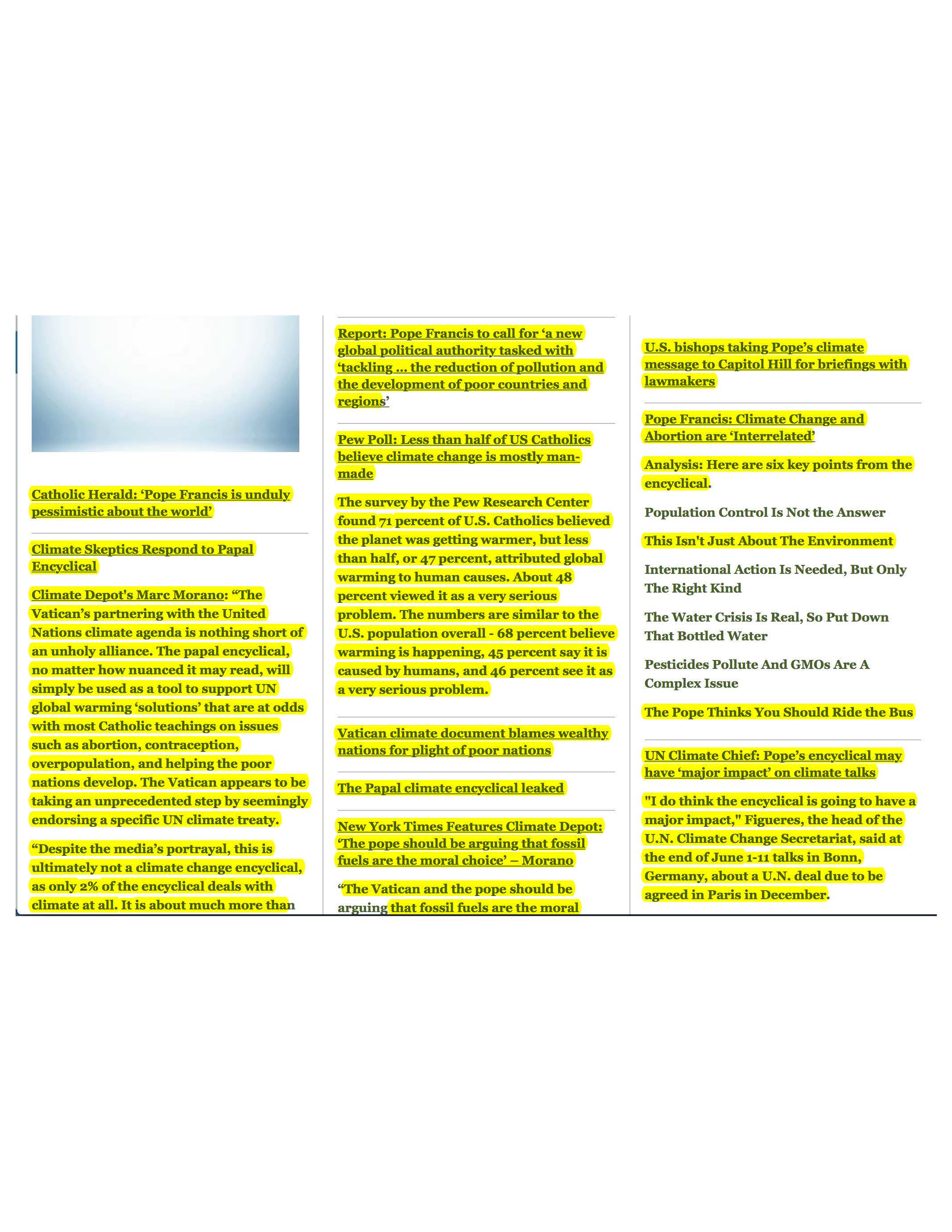 Here’s the thing: the paid right wing shills have ramped up their attacks on the Pope, the Vatican, Catholicism, religion, etc., to a near fever pitch. Following the script and the playbook that they use EVERY DAY, they have fanned out and are disparaging every single aspect of the Pope’s being, start to finish. True to form. It is, typically, vicious. Take, for example, this harried tactic of Marc Morano’s….he posts (on Climate Depot) some article that he wants his followers and fellow shills to descend upon. Here is a screen shot, as an example, from that piece of shit website, ClimateDepot: