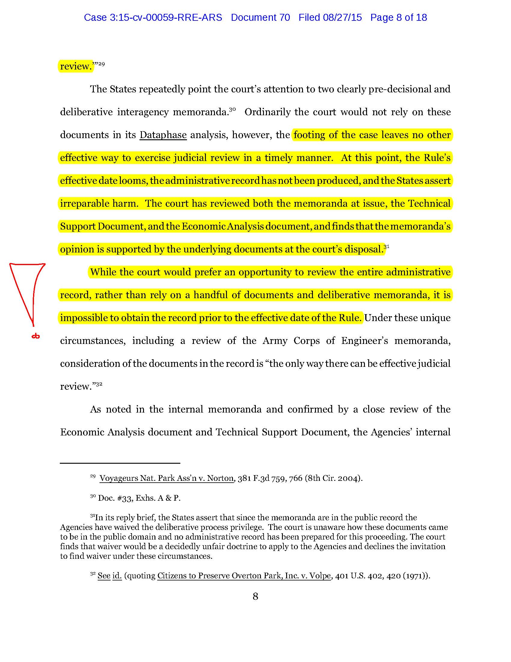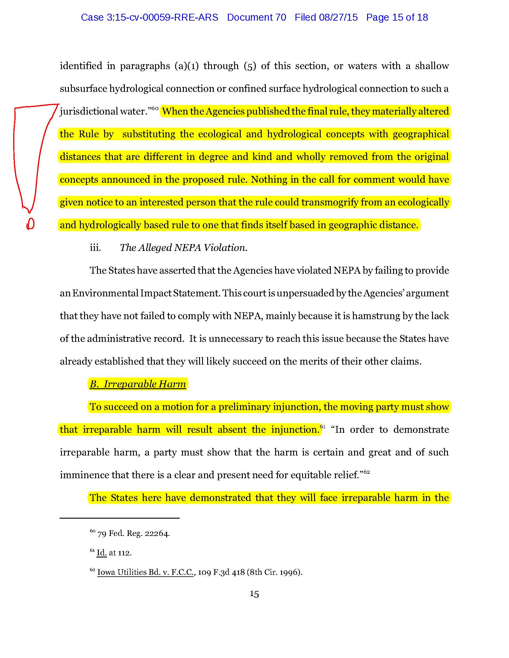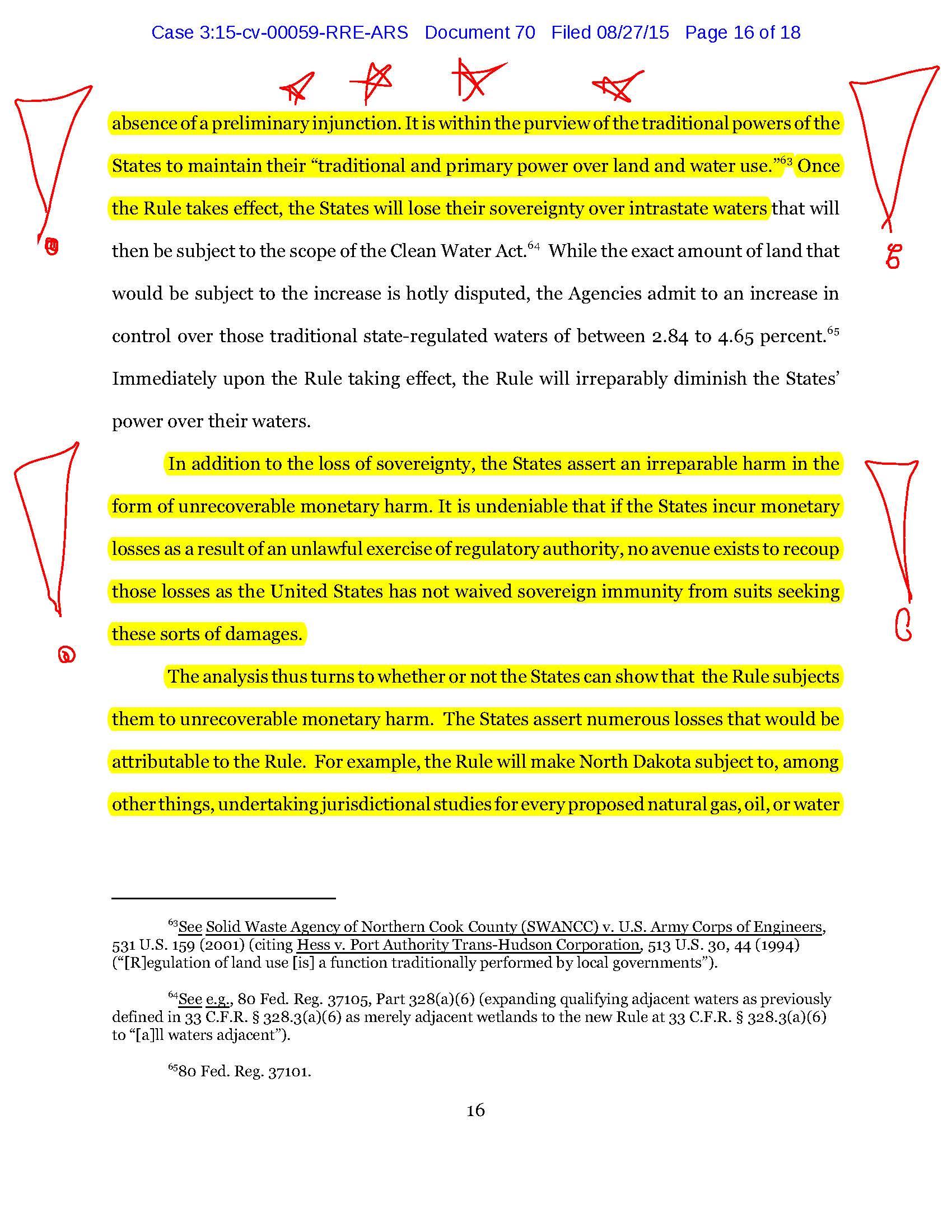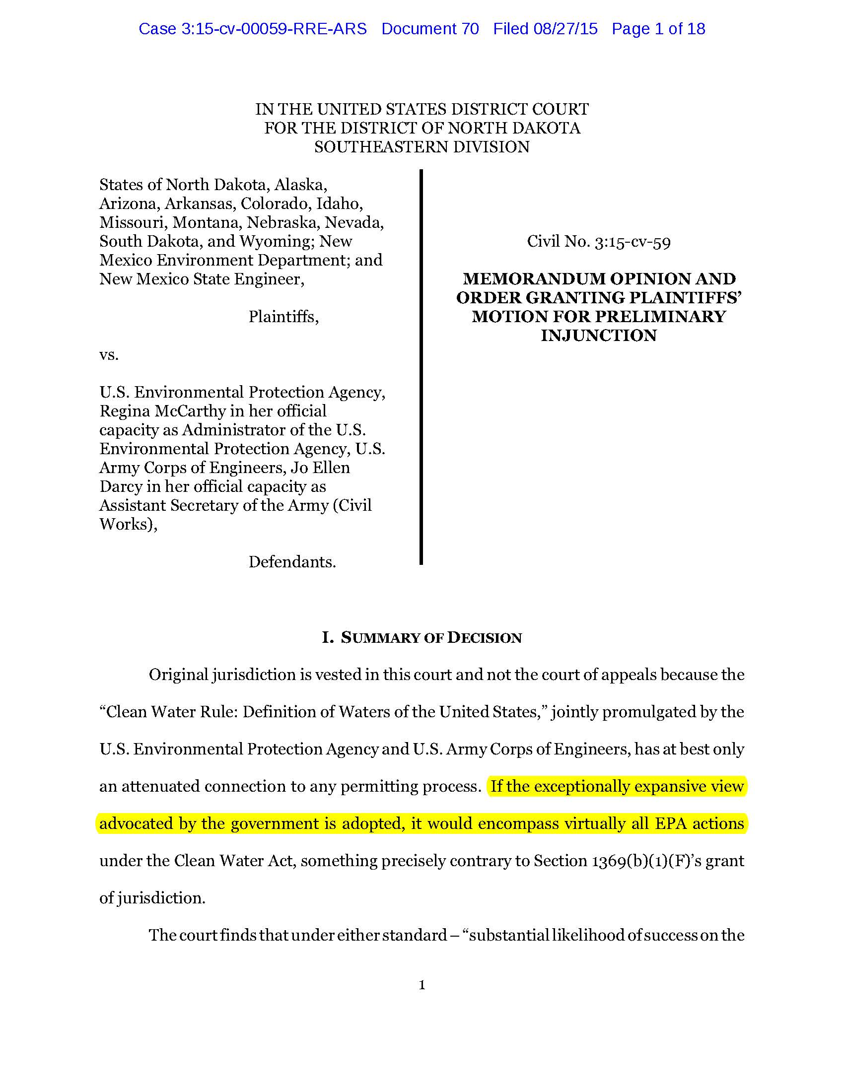 Okay, so here’s where I’m going with this… even though The Hill article is about potential overreach by the EPA, the preemptive “logic” behind it would, and could, apply to the Trans Pacific Partnership if it were in the right legal “hands.” I’ve marked up the legal decision from the federal court in North Dakota (below) so that you can just scroll through it. It becomes particularly relevant by page number 15.