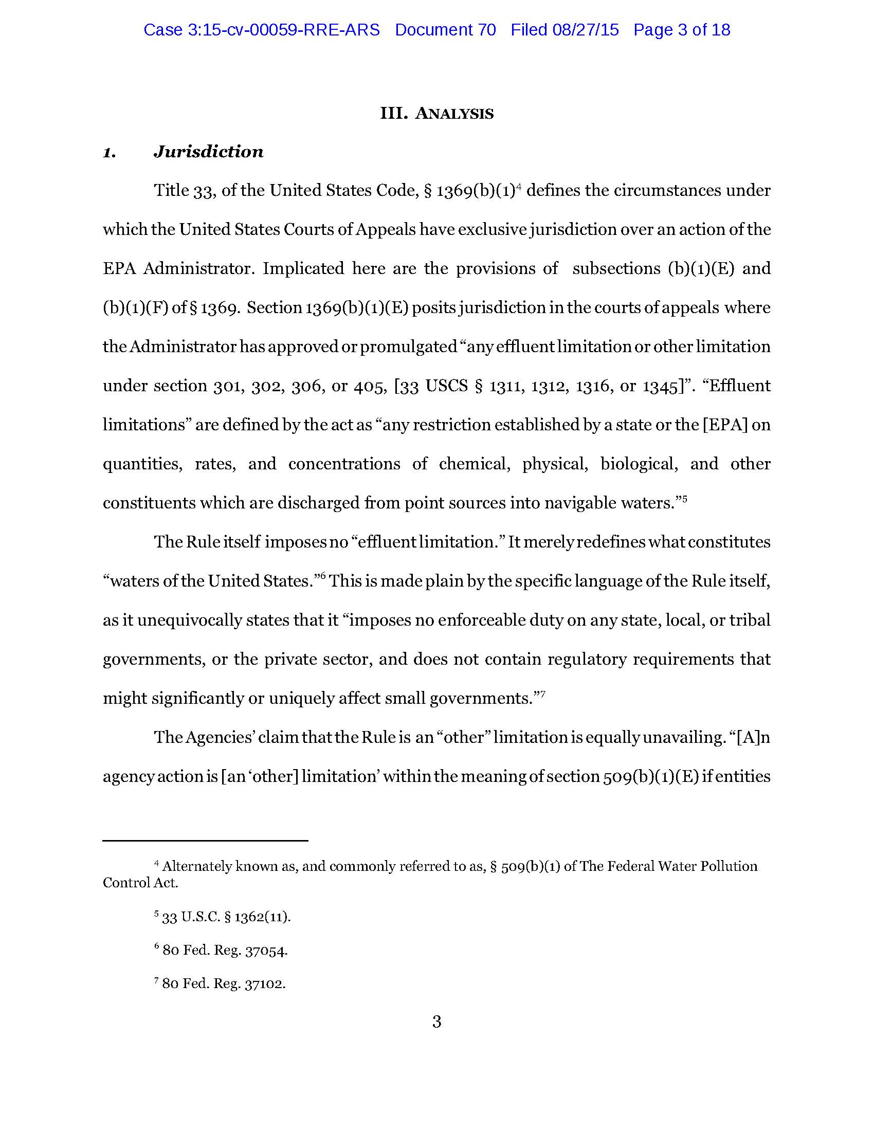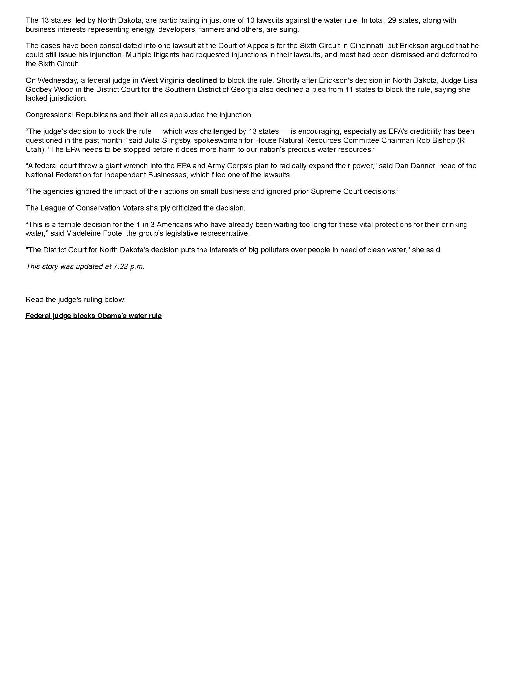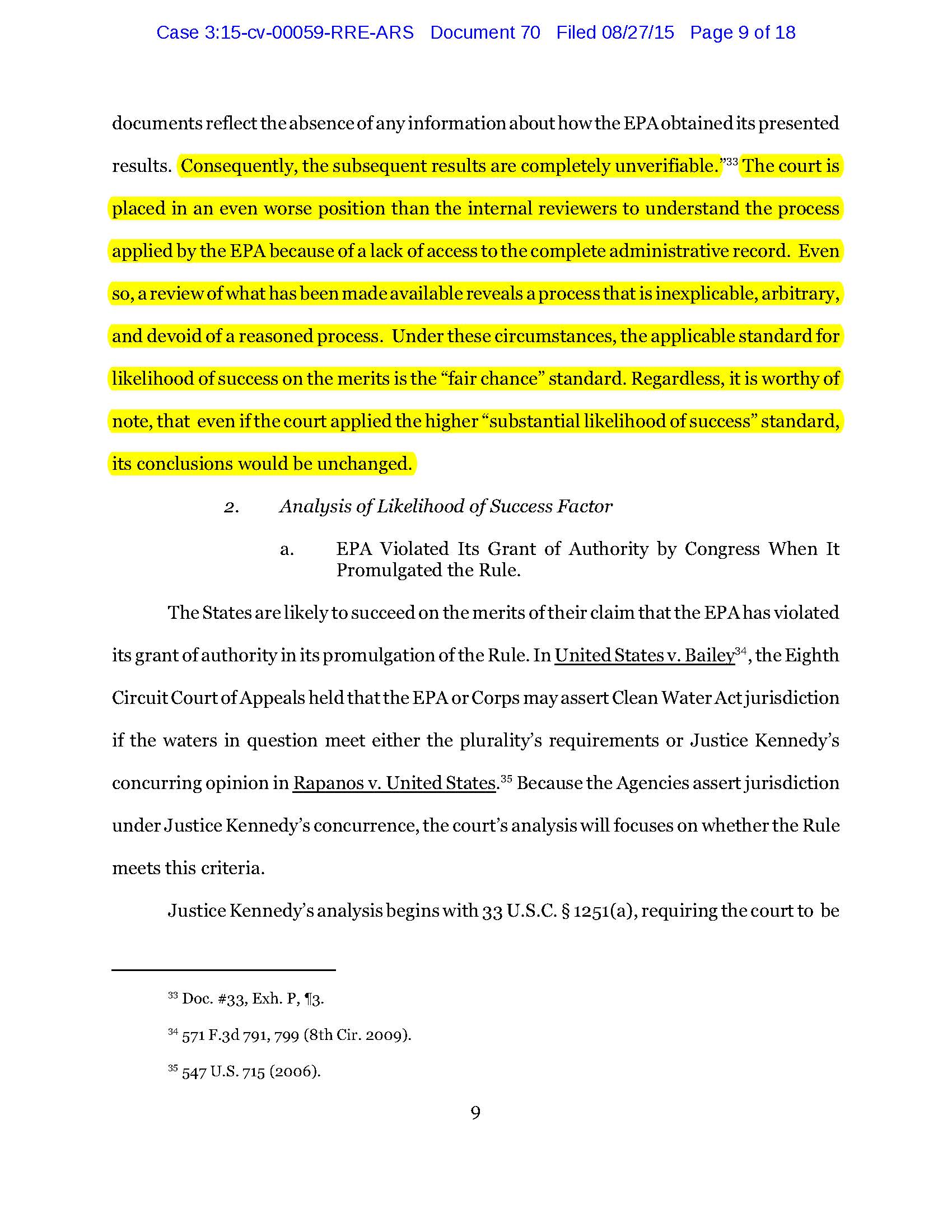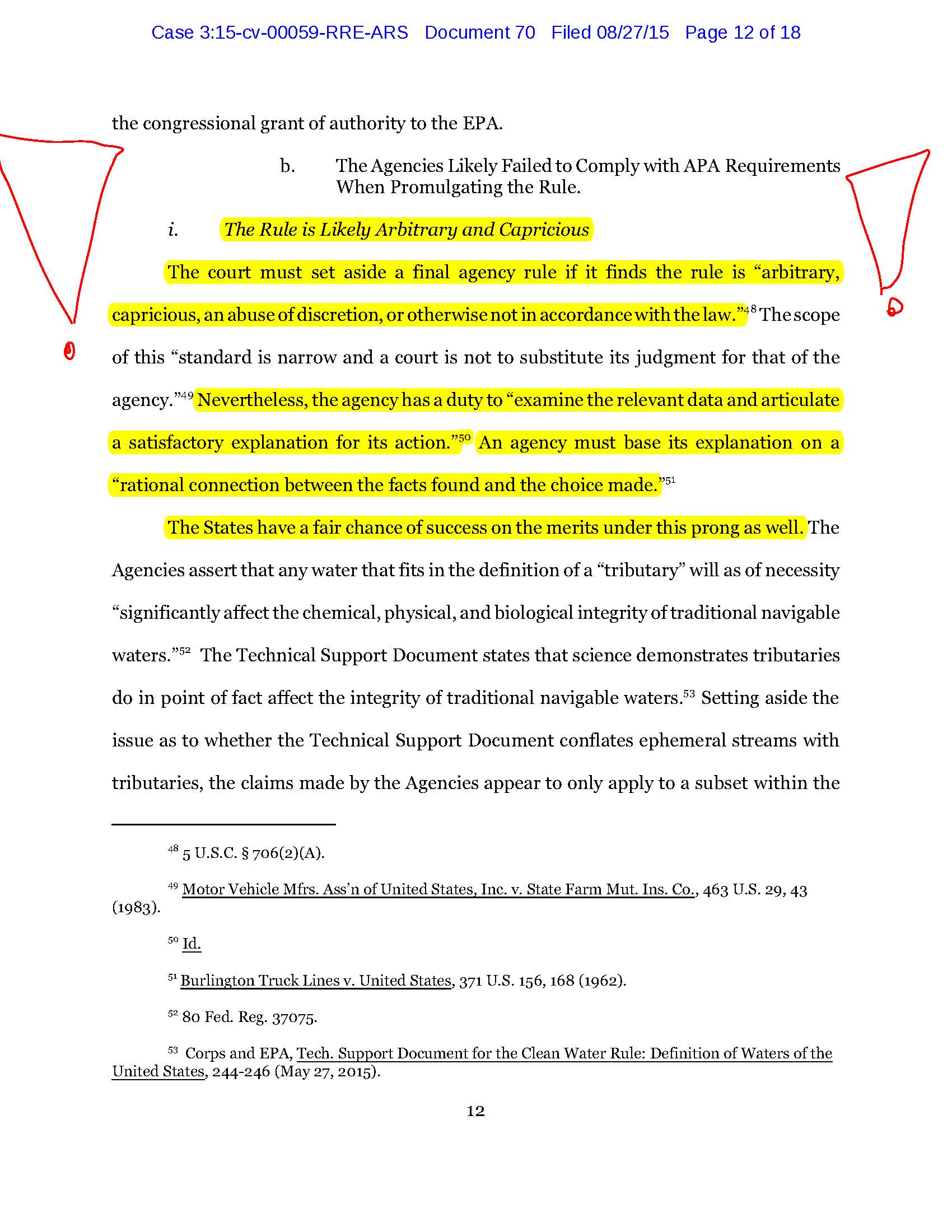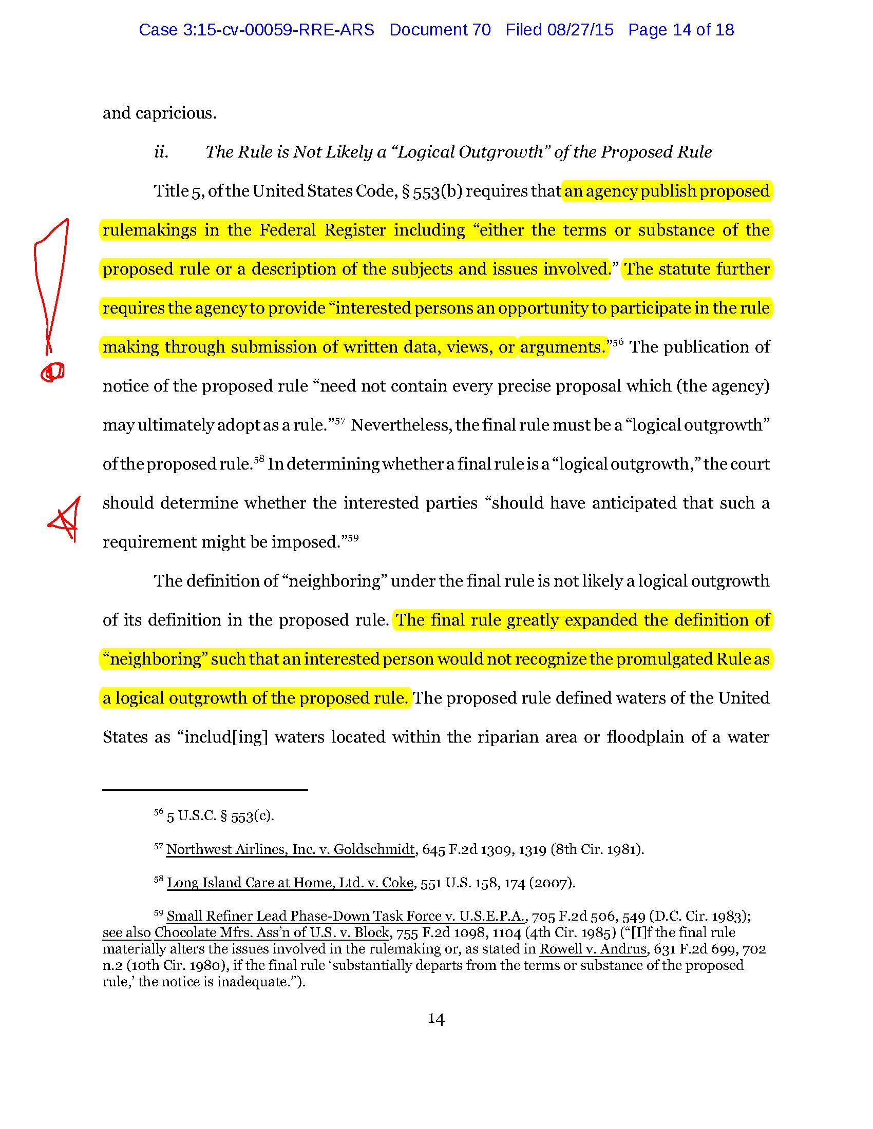 Okay, so here’s where I’m going with this… even though The Hill article is about potential overreach by the EPA, the preemptive “logic” behind it would, and could, apply to the Trans Pacific Partnership if it were in the right legal “hands.” I’ve marked up the legal decision from the federal court in North Dakota (below) so that you can just scroll through it. It becomes particularly relevant by page number 15.