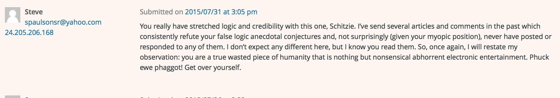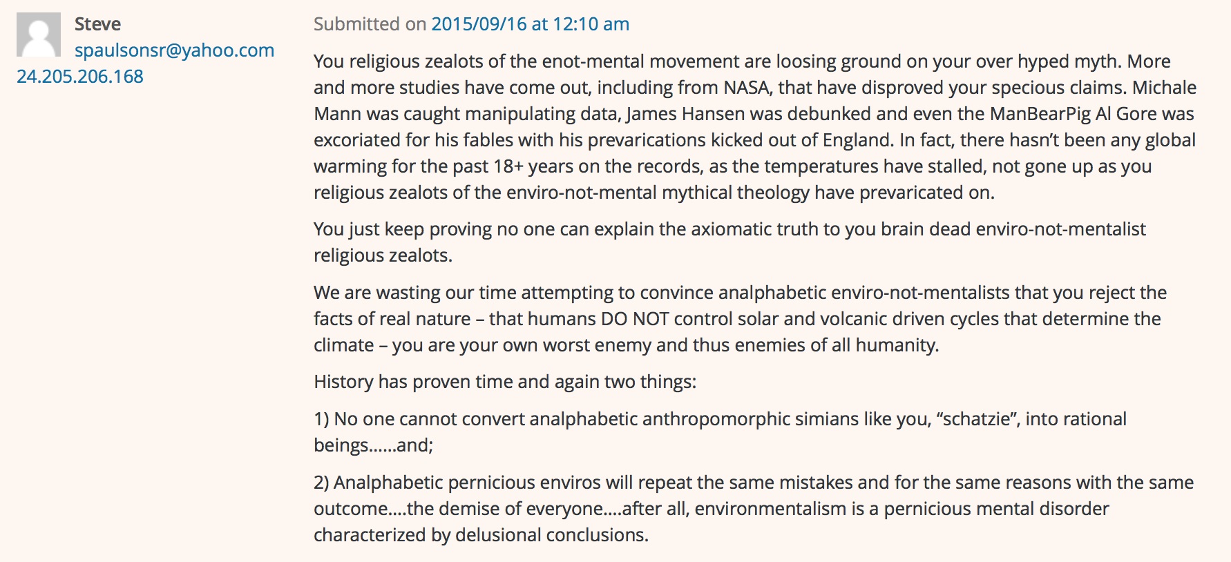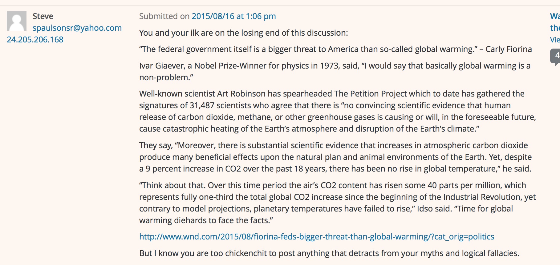 I wish I could say that Steve Paulson was the exception, instead of the rule to climate change deniers. The hardcore ones, in other words, the guys that will harass and bother me, fall into only 2 categories. Paulson goes under the heading of “nitwit.” He’s genuinely not intelligent or funny, and yet, he’s absolutely positive that both of those qualities apply to him…in spades.