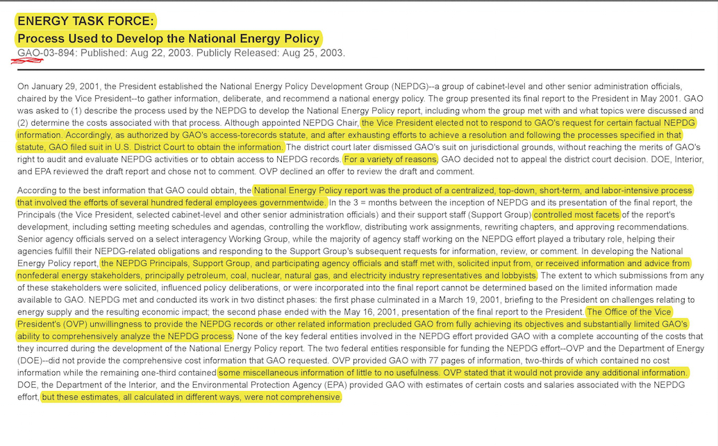 Immediately following release of the NEPDG report in May 2001, the Sierra Club and Judicial Watch sued Cheney and his task force seeking to have documents pertaining to the creation of the report released. Task forces such as Cheney’s typically have reporting requirements under the Federal Advisory Committee Act (FACA). Even the National Petroleum Council has to abide by FACA regulations. However, Cheney and his task force ignored literally all of their FACA requirements, from the usual release of documents pertaining to meetings, to a list of members, and a requirement to hold transparently public meetings. The federal District Court and the DC Court of Appeals ruled against Cheney and the task force, but their decision was overturned on appeal in the US Supreme Court. A Government Accounting Office (GAO) investigation into the task force was then requested by Congress, but it met with the same wall of silence from Cheney and the people who had worked on the report. Consequently, the GAO also decided to sue Cheney although that lawsuit sputtered to a more dubious end. It’s incredibly damning to read their final assessment of Cheney (who is referred to as OVP) and his task force activities. I’ve never read a more “angry” government report written about “itself.”