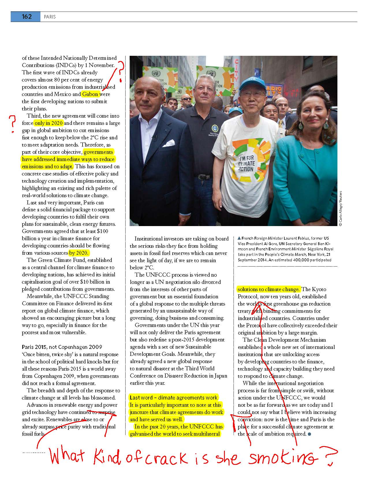 Contrary to her assertions, this entire “thing” COULD have been solved decades ago. If she needs help figuring it out, PERHAPS she should consult with someone OTHER than a cocktail-party full of fossil fuel executives. I have laid out several plans myself. In detail. It’s not difficult, lady. It would have required only ONE STEP if it had been done 20+ years ago and even today, with all that time wasted, it’s still just ONE step. Actually, I can sum it up in just four words (as opposed to the thousands and thousands that this bunch of sell-outs have squandered). 23 years of wasted time, effort, frequent flyer miles, false importance, and fake pageantry can be turned around if we simply: