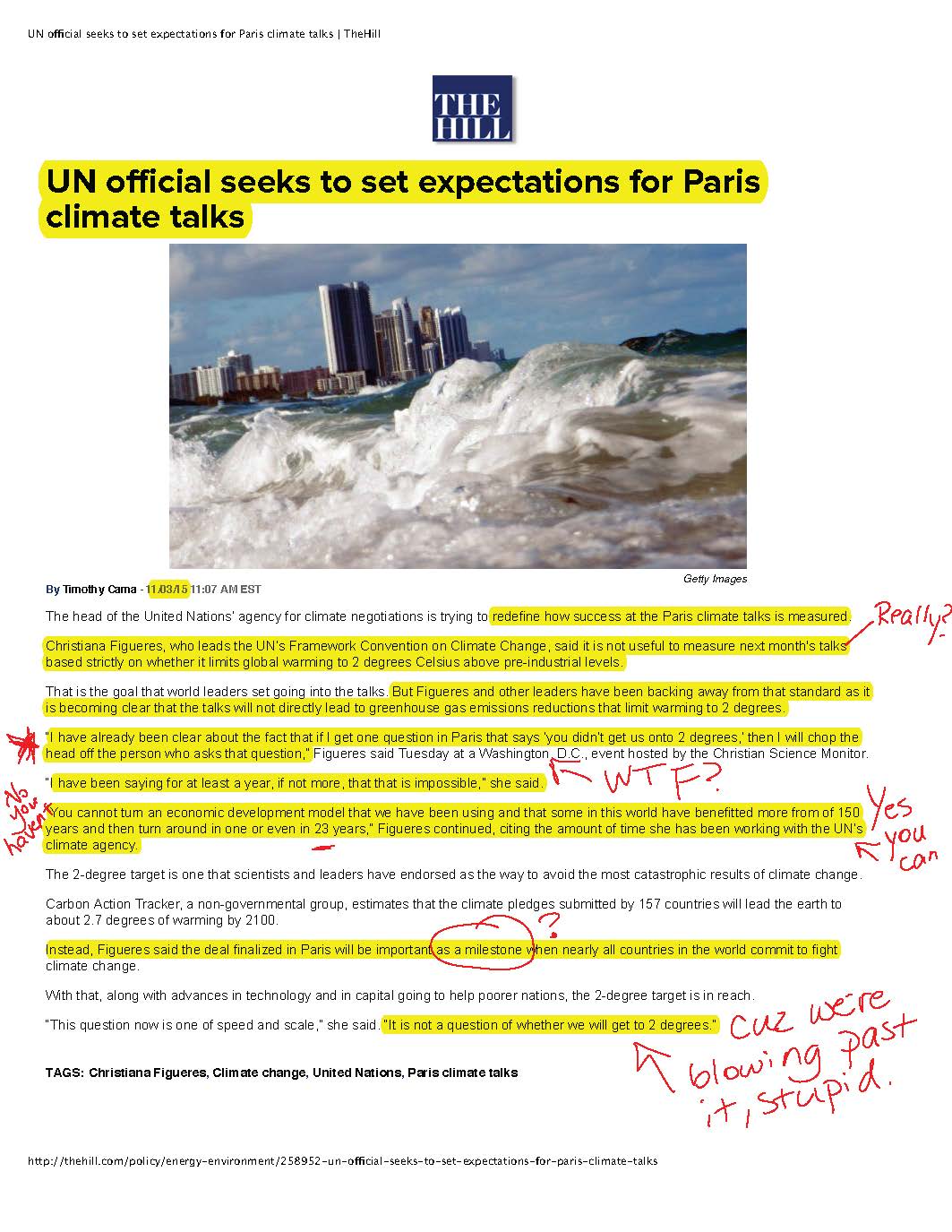 Okay, now here is something that just appeared in The Hill and as you read this, keep in mind that she just said (in June 2015) that 2 degrees was a reachable goal:
