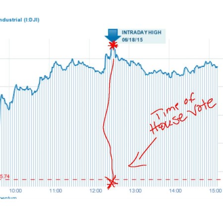 Dow Jones spikes right at the moment TPA passes in the House. What a coincidence!